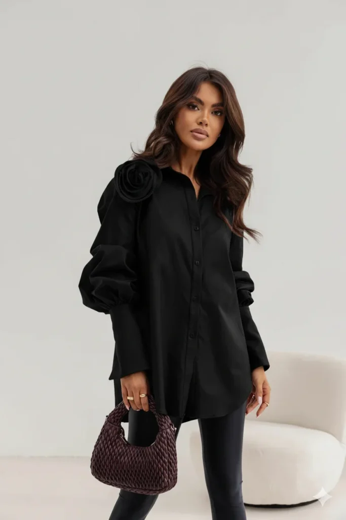 Cămașa dama Madame OVERSIZED este o cămașă supradimensionată grozavă, cu o lungime asimetrică, spatele este puțin mai lung. Există un buzunar la piept si are nasturi. Un element caracteristic sunt manșetele lungi, prinse cu doi nasturi.