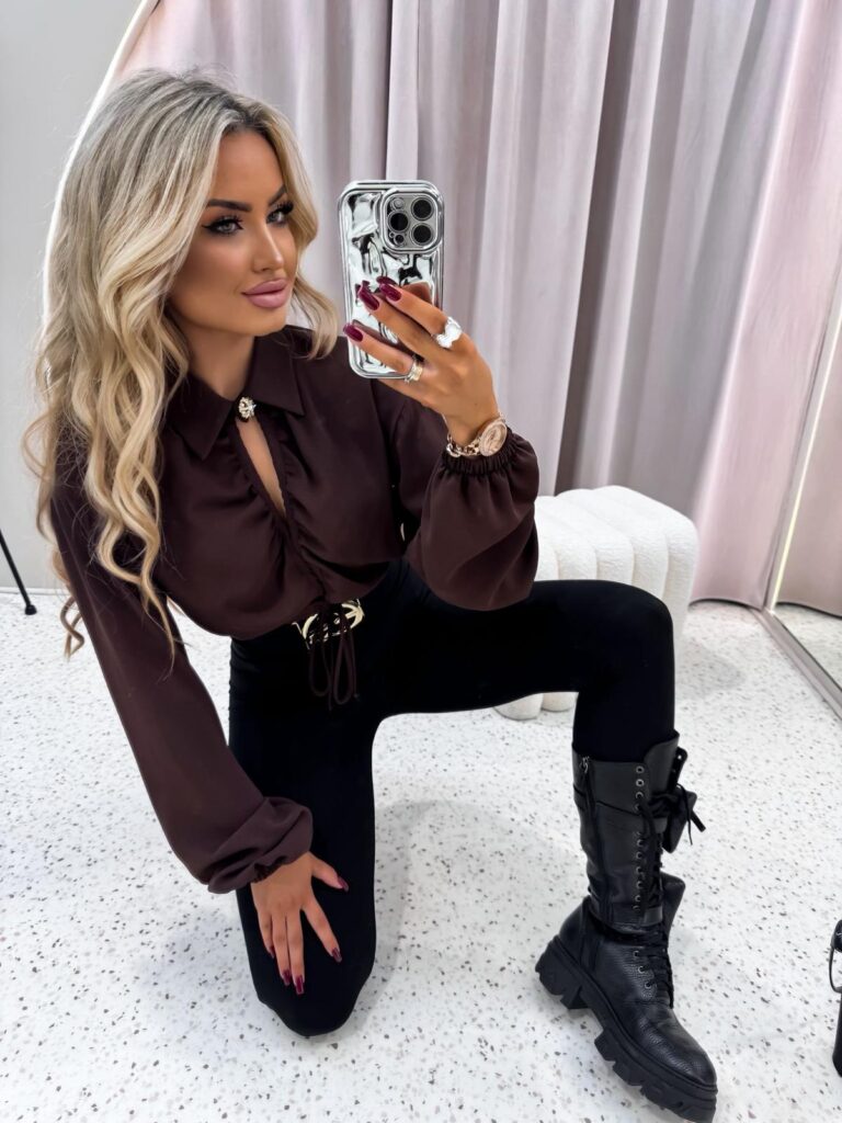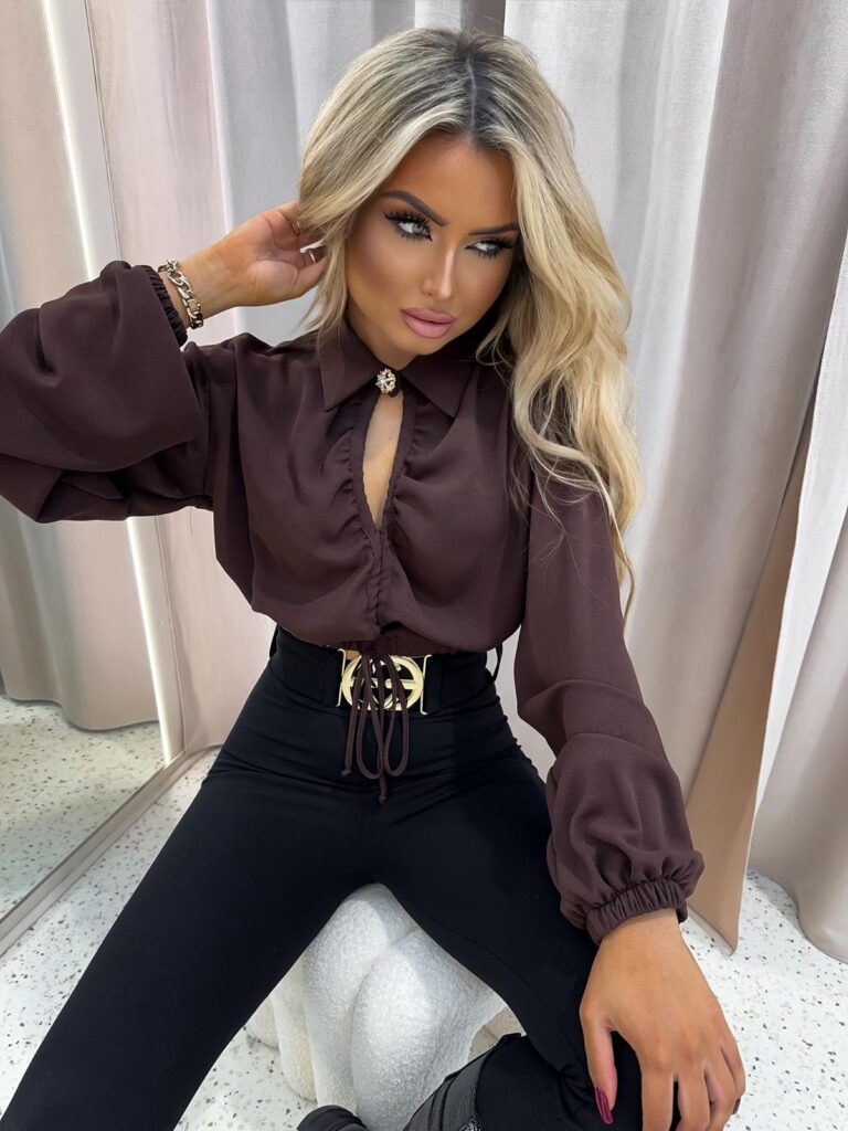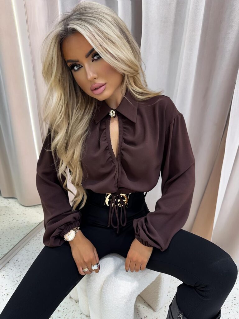 ✨ Cămașa maro Aisha este piesa must-have din garderoba ta – elegantă, feminină și versatilă.