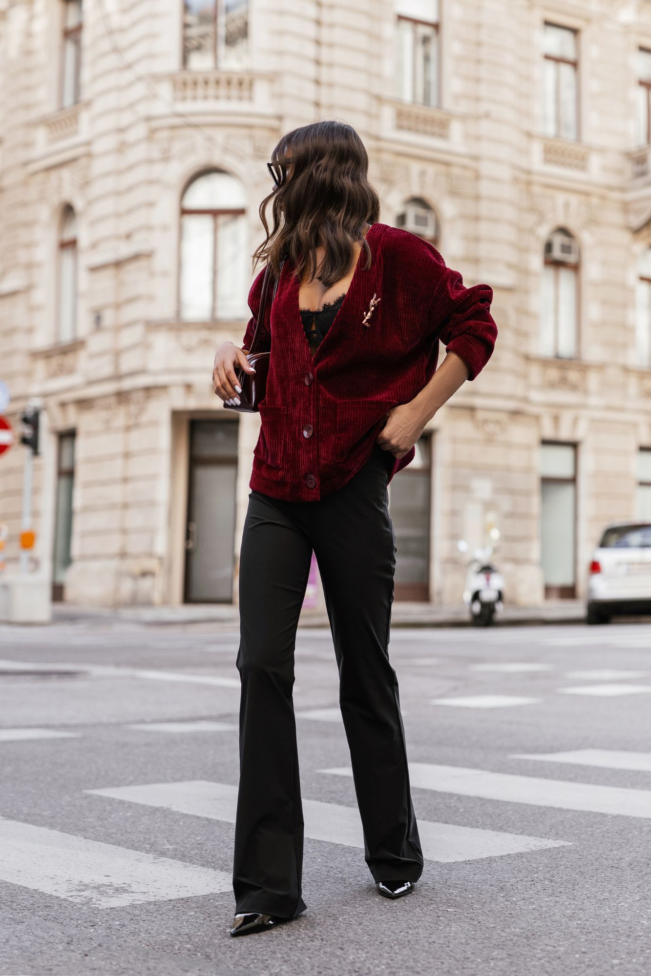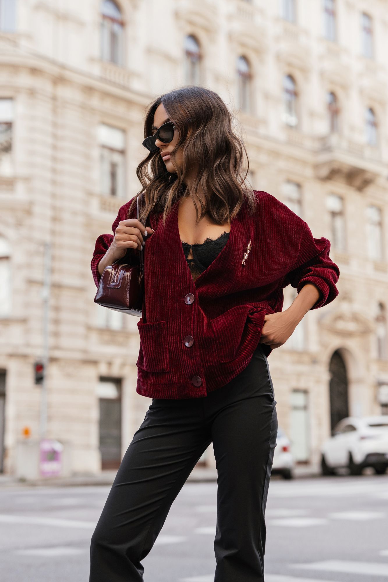 Cardiganul Velvet Bordeaux adaugă instant un aer luxos oricărei ținute. Textura moale și luciul subtil al catifelei reiate oferă o notă elegantă, ideală pentru serile reci de toamnă sau o ieșire în oraș.