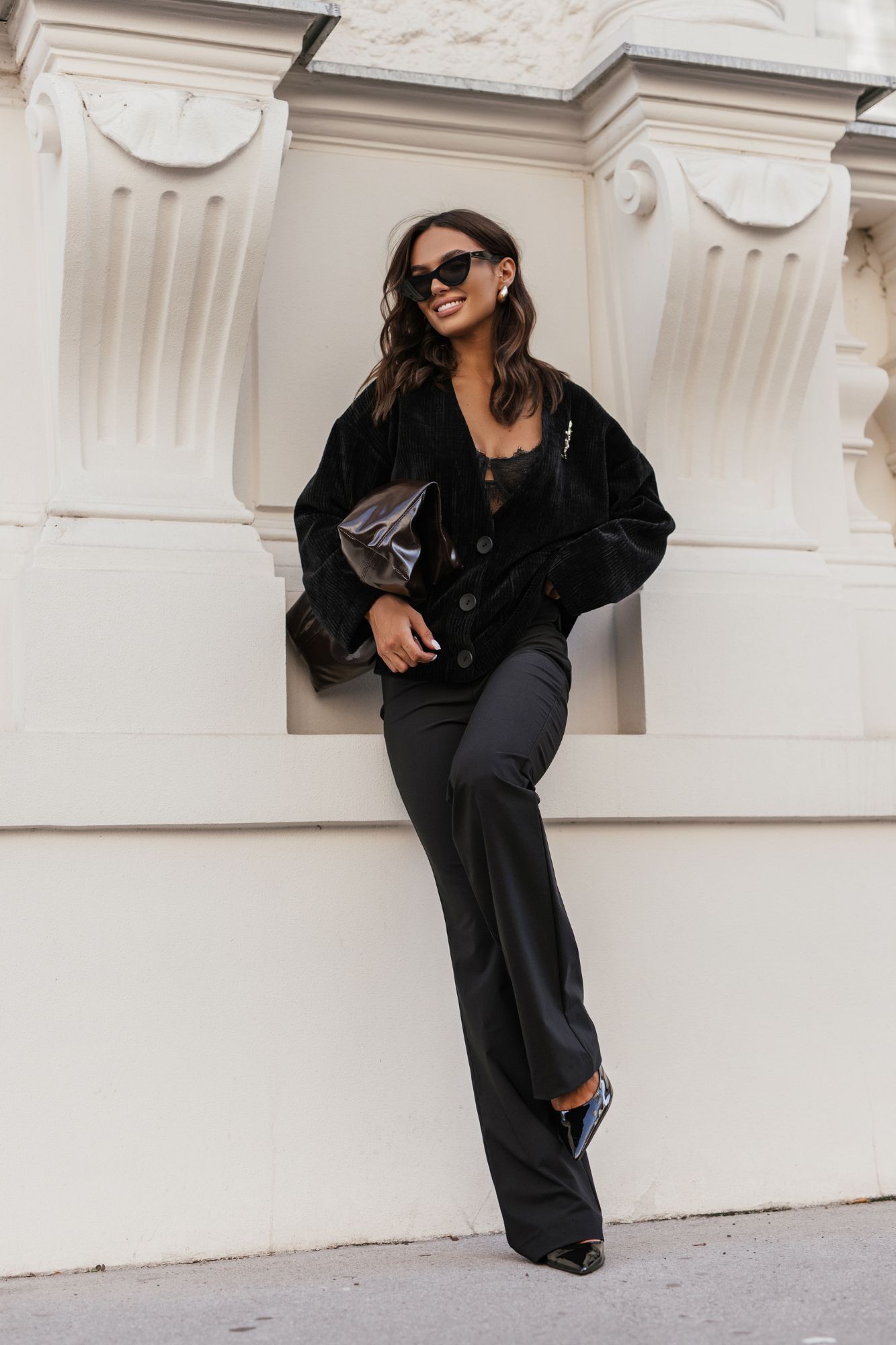 Cardiganul Velvet Noir îmbină eleganța catifelei cu lejeritatea unei croieli moderne. Ideal pentru un look sofisticat de zi sau pentru o ieșire de seară, se remarcă prin textura sa moale, lucioasă și prin versatilitatea stilului.