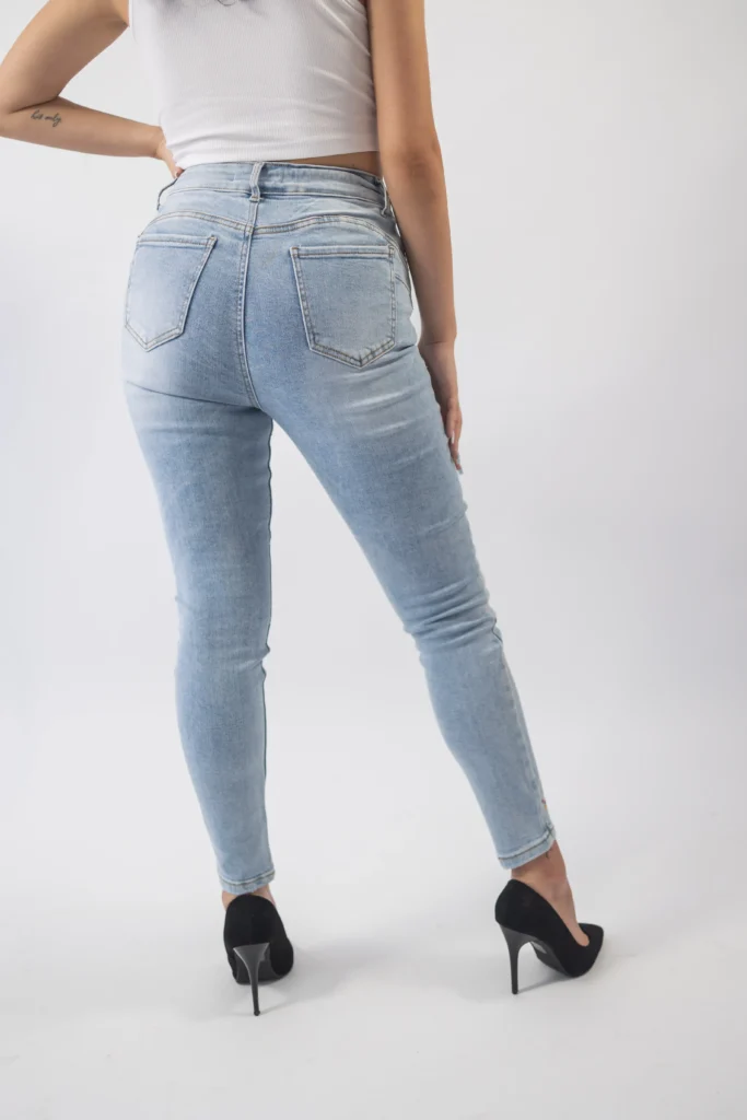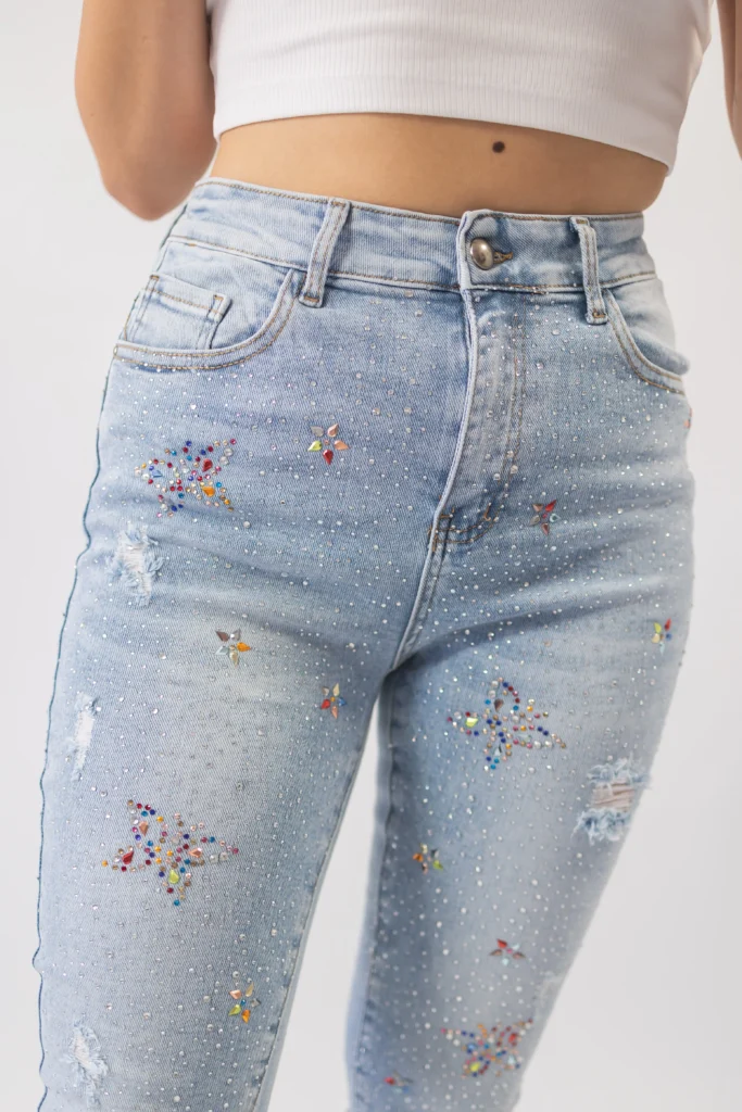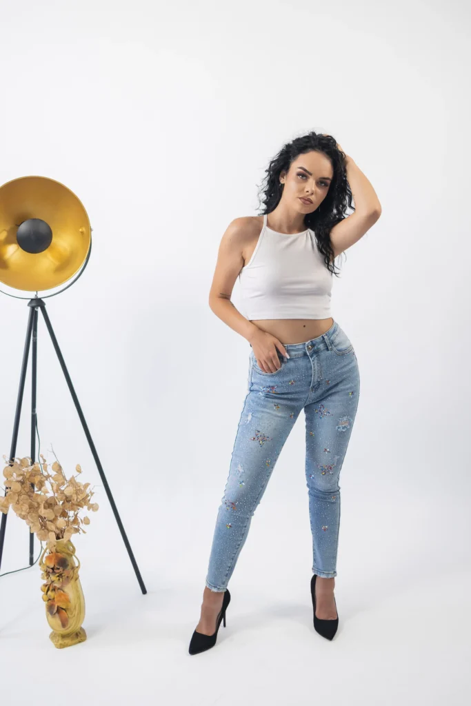 ✨ Adaugă un plus de farmec ținutelor tale cu acești blugi skinny spectaculoși, decorați cu pietre strălucitoare și detalii cu fluturi colorați! Ideali pentru zilele în care vrei să te simți specială și să ieși în evidență.