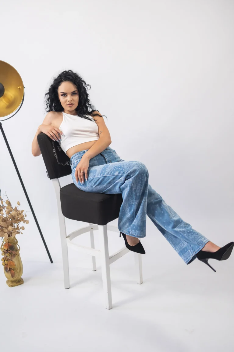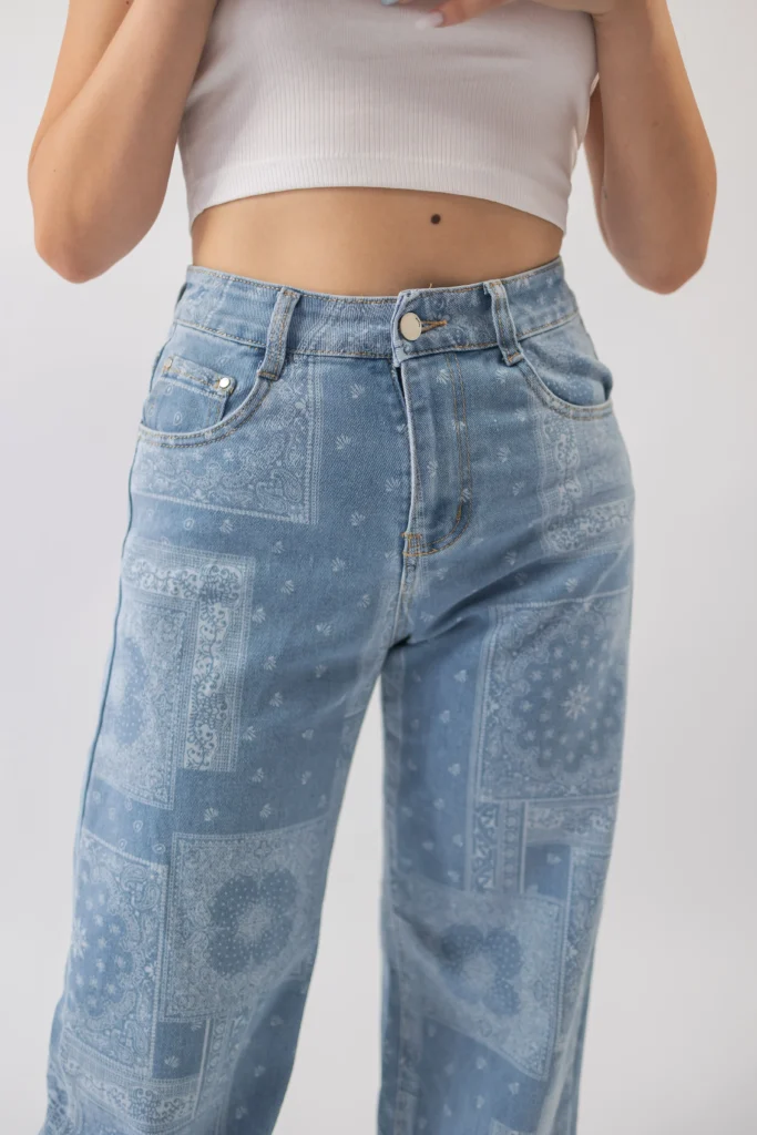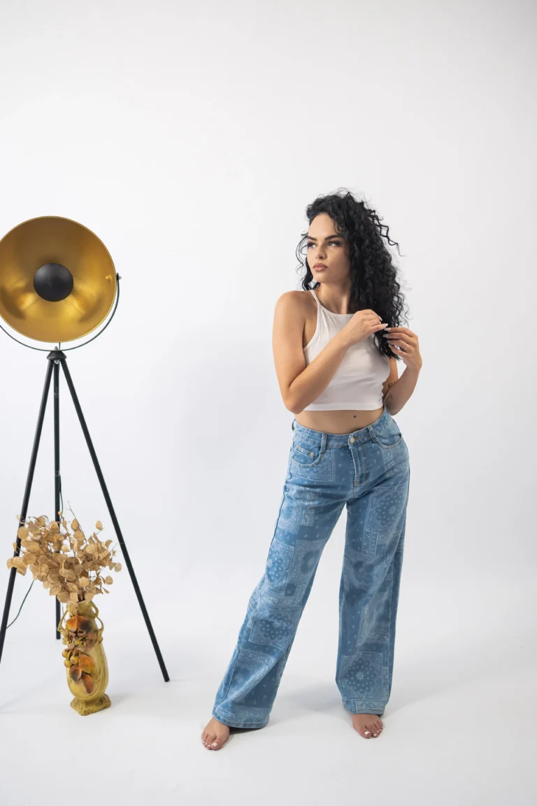 🧵 Blugii cu model patchwork vintage sunt alegerea ideală pentru un look fresh, relaxat și original! Cu un model patchwork subtil și imprimeu alb pe albastru denim, acești pantaloni evazati adaugă o notă boho și vintage garderobei tale.