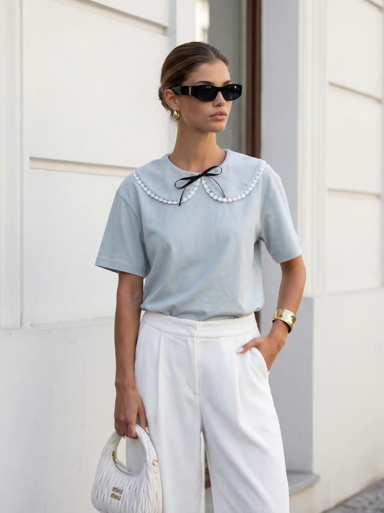 Un tricou cu design rafinat, creat pentru ținute curate și bine definite. Gulerul amplu cu dantelă fină și funda contrast adaugă un accent elegant, fără să încarce. Se potrivește ușor în ținute casual chic sau smart casual, de zi sau de seară.