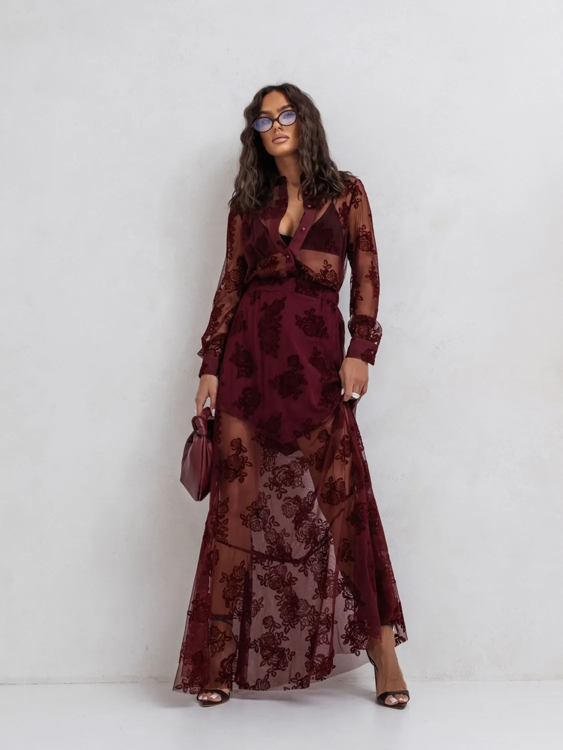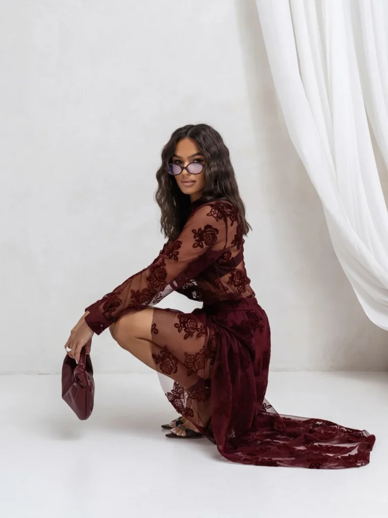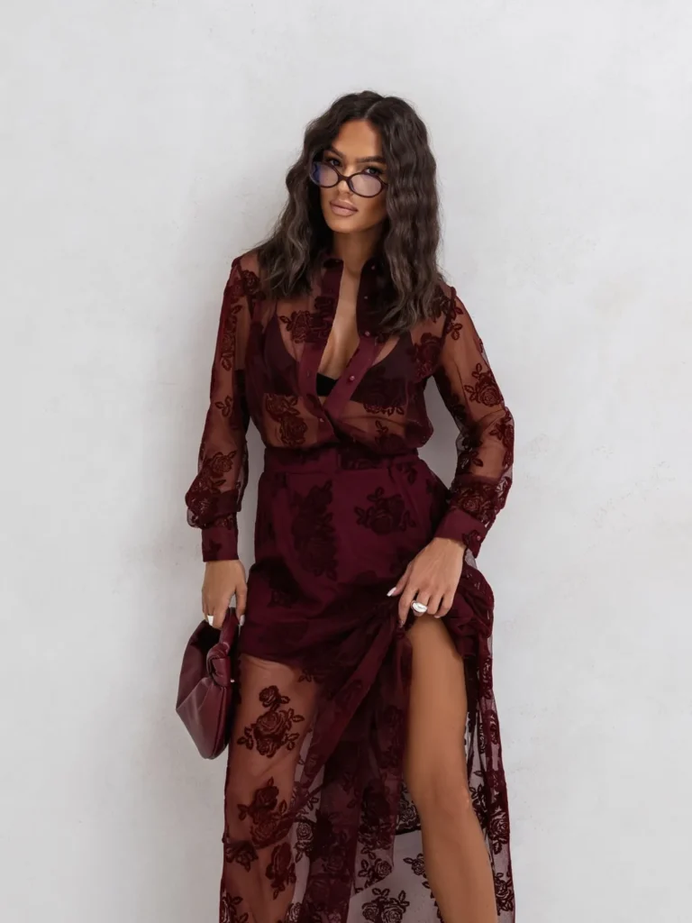 Setul Thelma este alegerea perfectă pentru femeia care iubește rafinamentul, dar și un strop de mister. Realizat din dantelă vișinie cu broderie florală, acest set spectaculos îmbină o cămașă vaporoasă cu o fustă lungă cu deschidere laterală, ideală pentru evenimente de seară, petreceri sau apariții elegante.